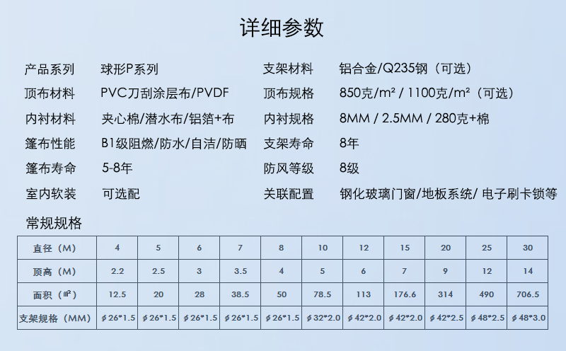 球形星空帐篷【峰顶】:圆顶【定制】:是【结构】:钢结构+膜结构【室内面积】:20平方,28平方,32平方,38平方等【造型规格】:半球形【地台规格】:按规格【阳